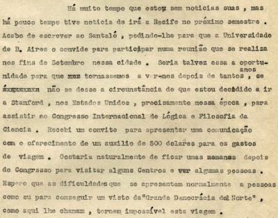 «Acabo de escrever ao Santaló pedindo-lhe para que a Universidade de B. Aires o convide para participar numa reunião que se realiza nos fins de Setembro nessa cidade. Seria talvez essa a oportunidade para que tornássemos a ver-nos depois de tantos anos, se não se desse a circunstância de que estou decidido a ir a Stanford, nos Estados Unidos, precisamente nessa época, para assistir ao Congresso Internacional de Lógica e Filosofia da Ciência.» – excerto de carta de António Aniceto Monteiro para Hugo Ribeiro, de 27 de Junho de 1960